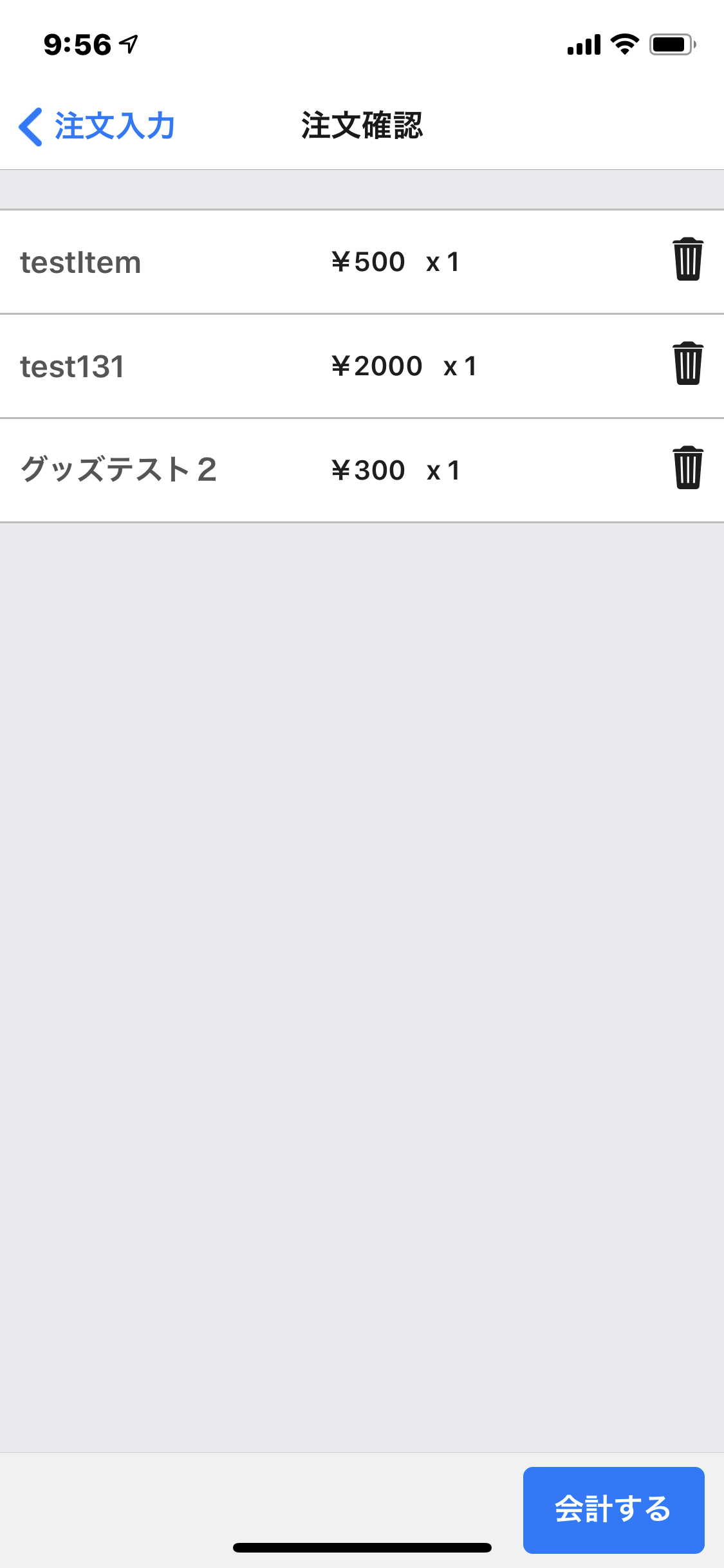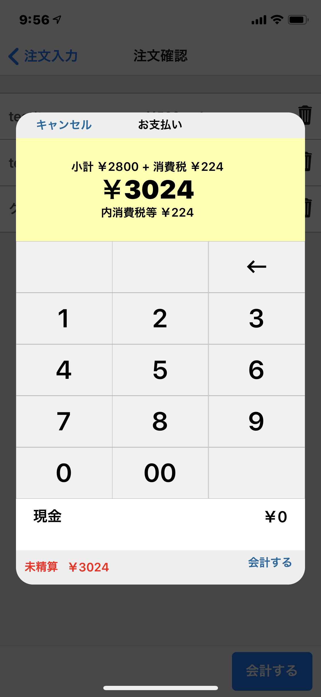 注文の内容に間違いがないことを確認し、『会計する』をタップすると、会計モーダルが表示されます。