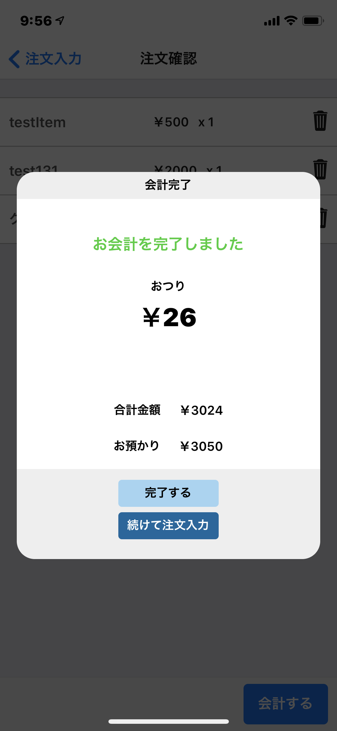 正しい金額が入力され、会計が完了すると、会計完了画面が表示されます。