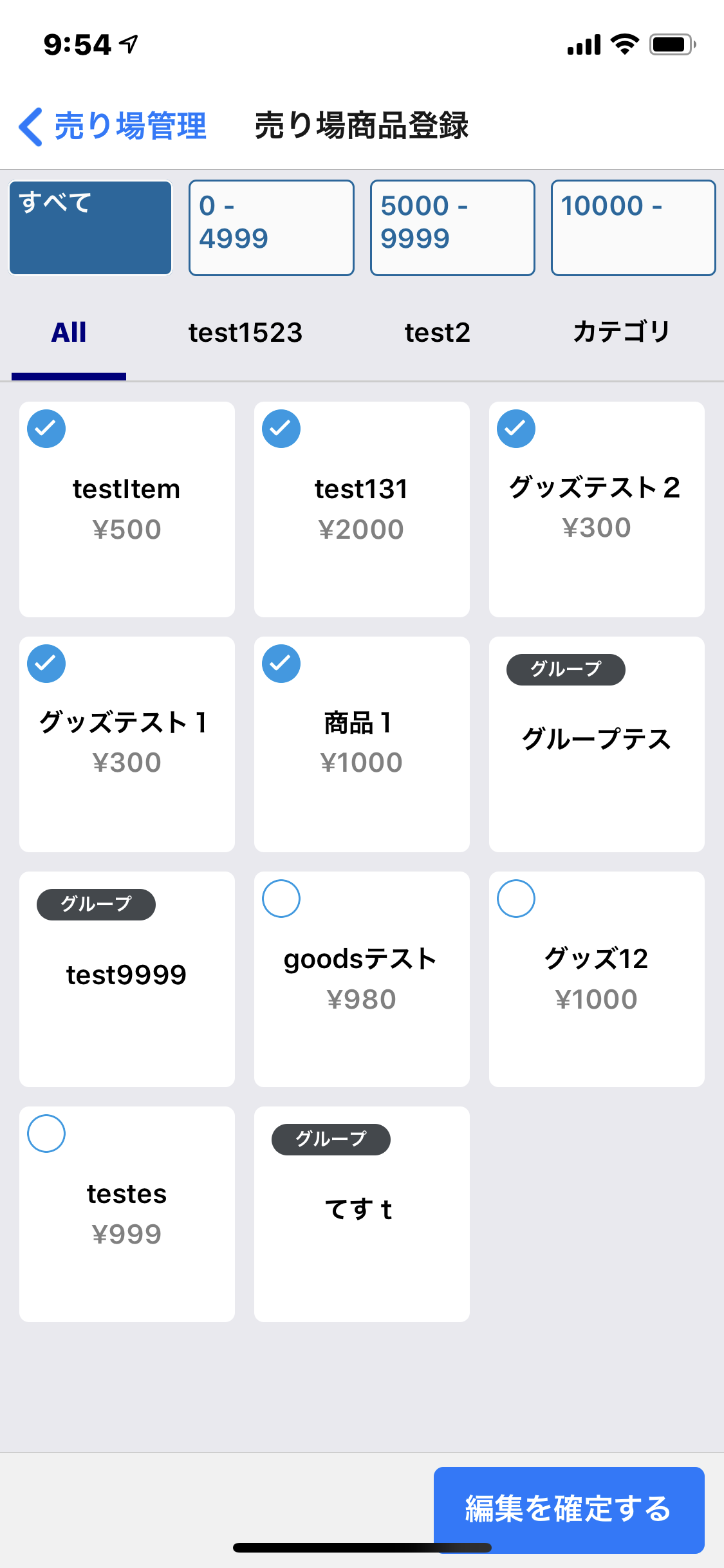 商品ボタンをタップし、商品ボタン左上のチェックマークのオン・オフを確認して、『編集を確定する』をタップすると、設定が完了できます。